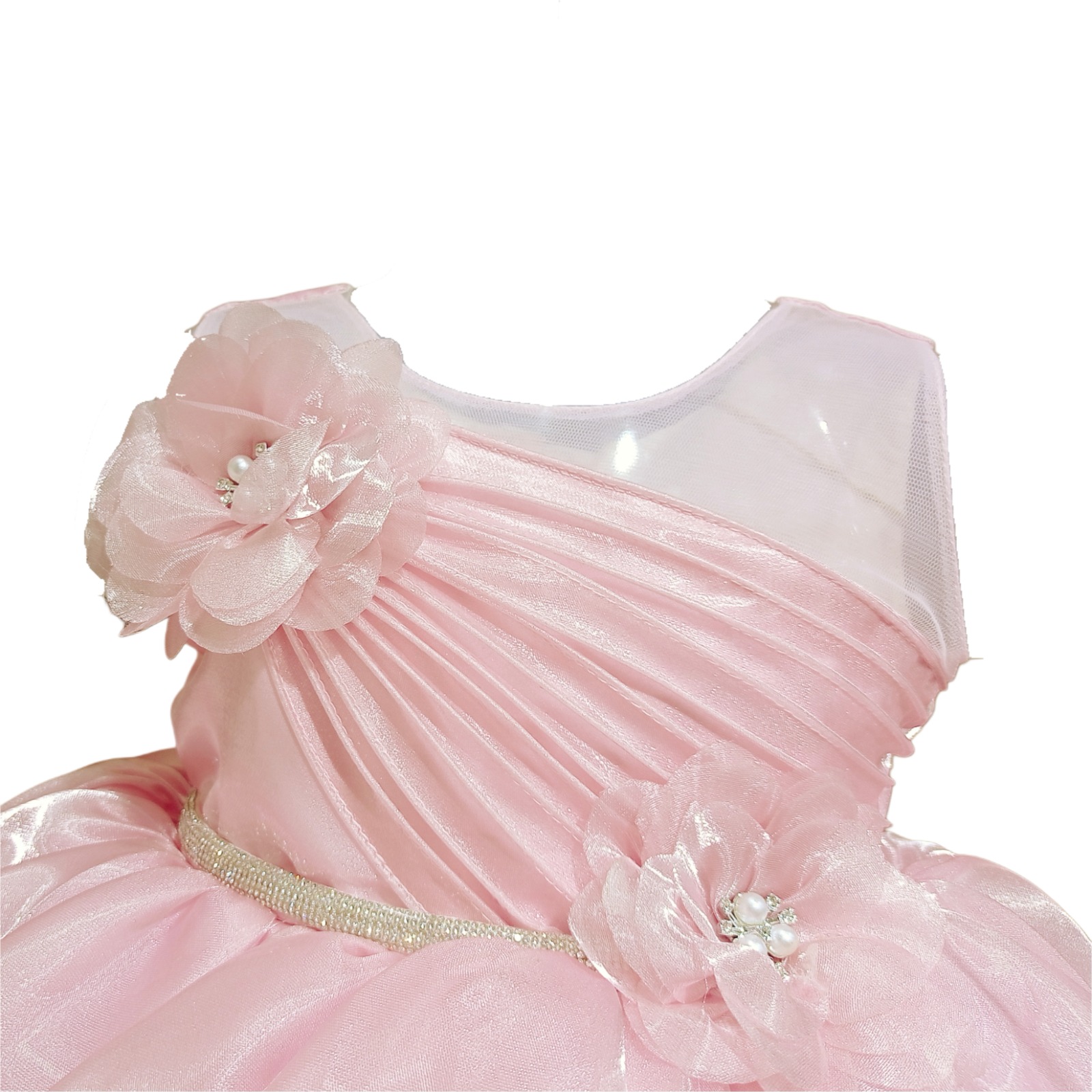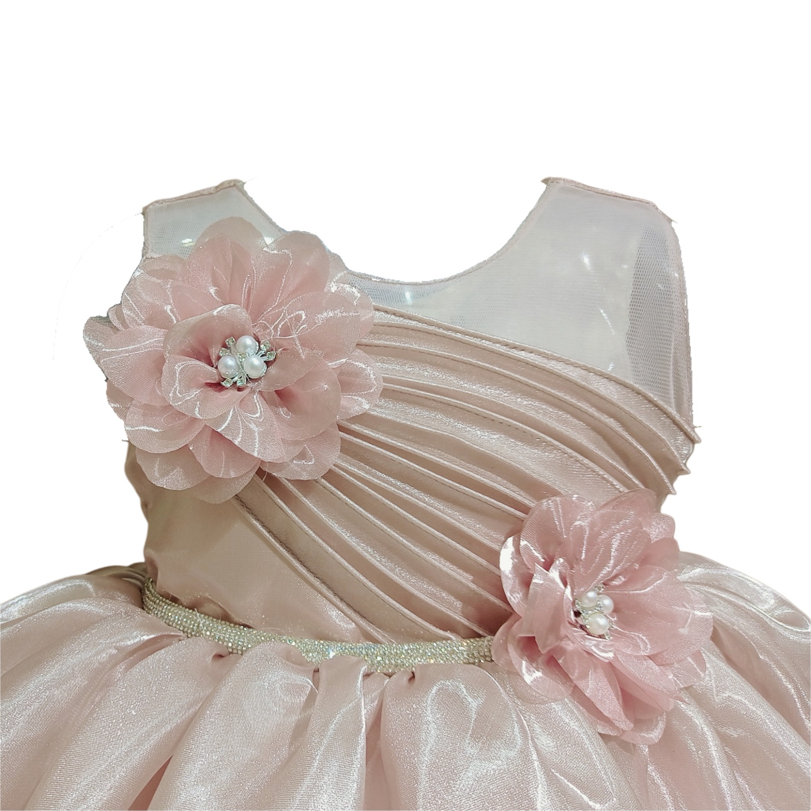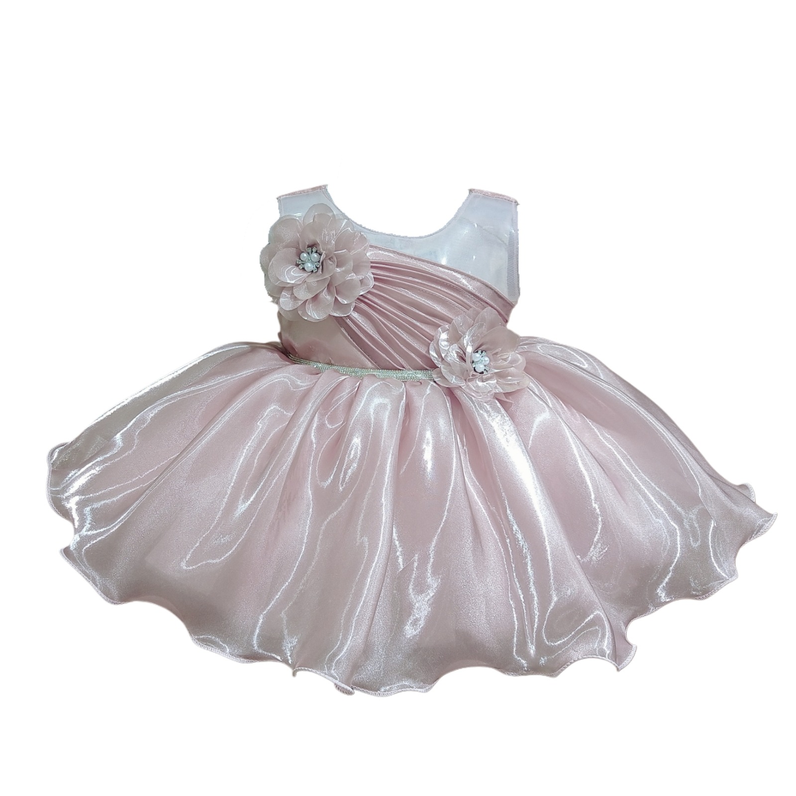 The front bodice is styled with diagonal pleated satin detailing, adding texture and a sophisticated touch. It is further enhanced with two decorative floral appliqués with pearl bead centers—one on the shoulder and another near the waist—bringing a lovely floral accent to the dress. A thin sparkling waistband highlights the waistline and separates the bodice from the skirt. The skirt is made from shimmering organza fabric, designed in a full flared silhouette that creates a voluminous and flowy princess effect.