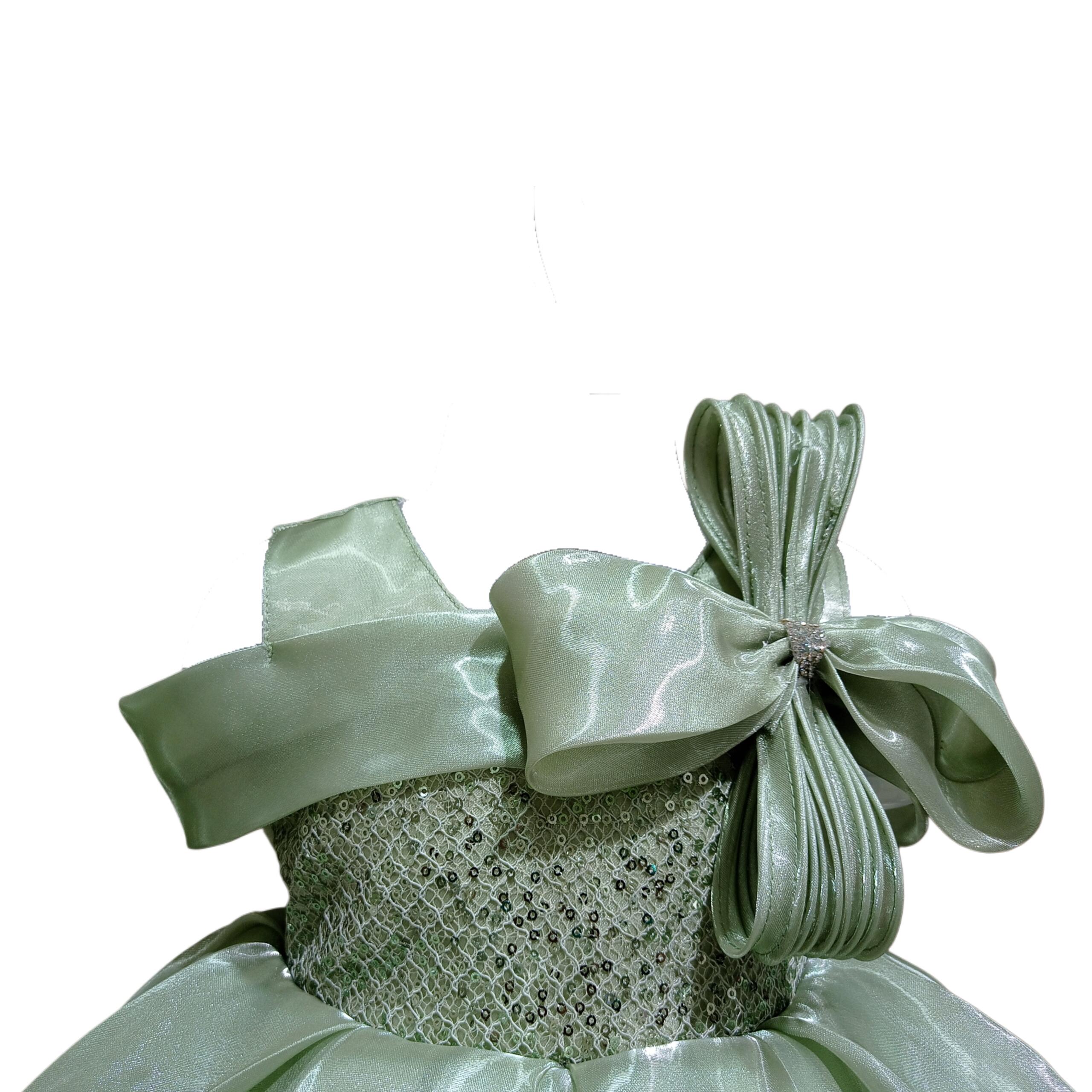 The soft mint green satin skirt flows into a voluminous flared silhouette, giving the dress a dreamy princess-style appearance. Crafted with lightweight and comfortable fabric, it ensures your baby girl stays comfortable while looking adorable throughout the day.