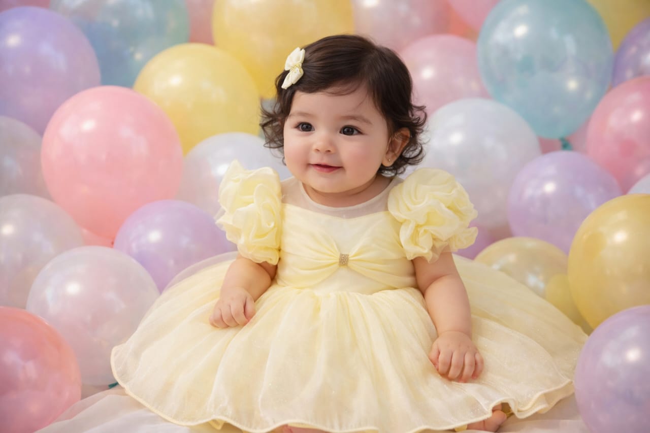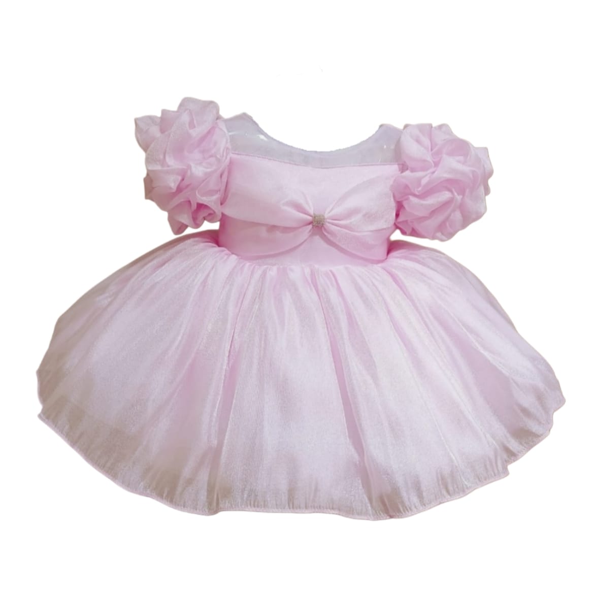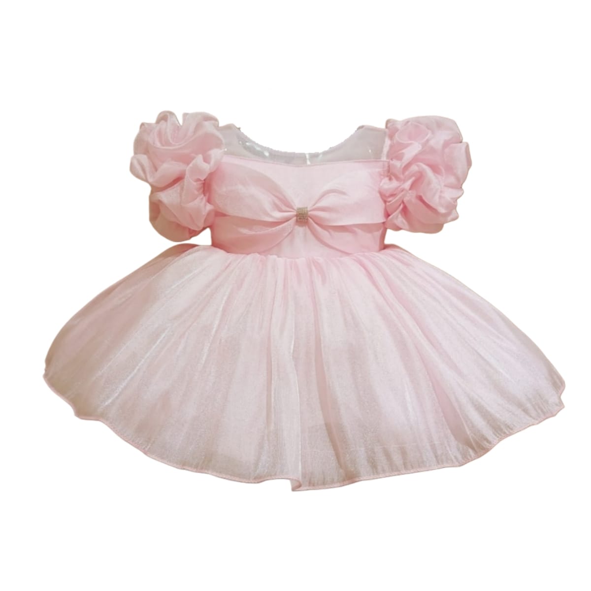 The dress features a graceful tulle skirt that creates a full, princess-style silhouette while remaining lightweight and breathable. Floral ruffle sleeves add a sophisticated touch, complemented by a neatly styled bow detail at the waist for a refined finish. The soft inner lining ensures gentle comfort against baby’s delicate skin, allowing free and easy movement throughout the day.
