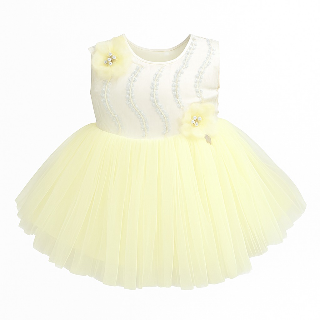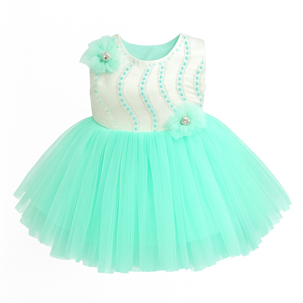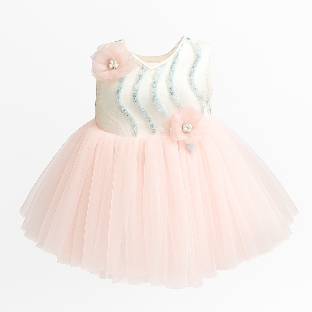 This beautiful pastel baby girl party dress is designed to make every moment feel special. The dress features a soft satin bodice adorned with shimmering sequins and delicate wave-pattern beadwork that adds a touch of sparkle. Charming floral appliqués with pearls and crystal centers enhance the overall elegance and give the dress a premium handcrafted look.