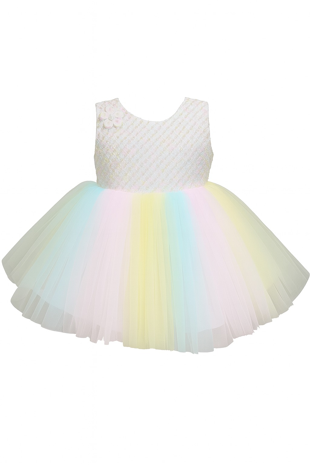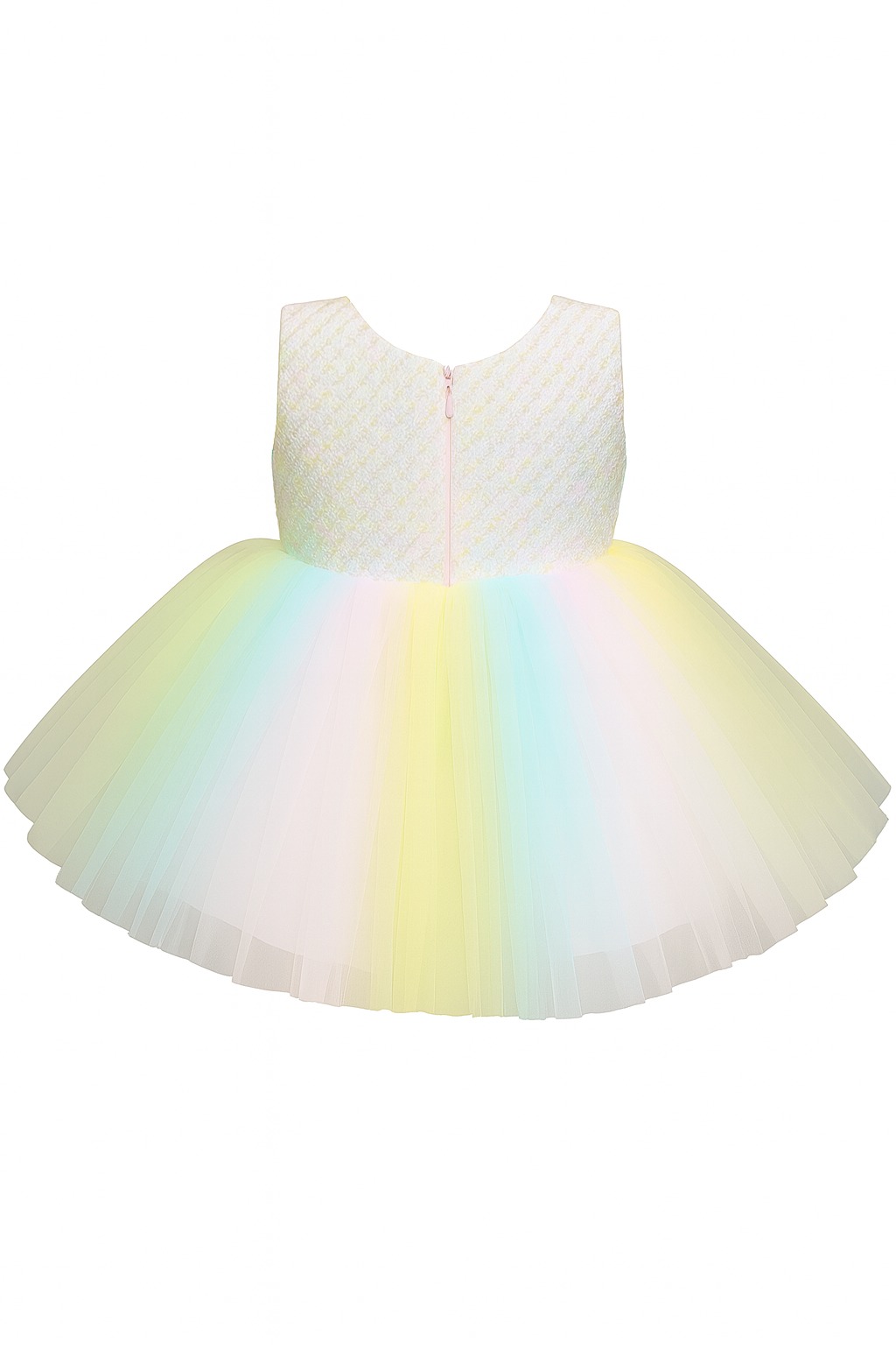 This beautiful pastel rainbow baby girl dress is designed to create a dreamy and magical look. The top portion of the dress features a textured sleeveless bodice in a soft ivory tone, adding a touch of elegance and comfort. The back includes a smooth zipper closure for easy wear.