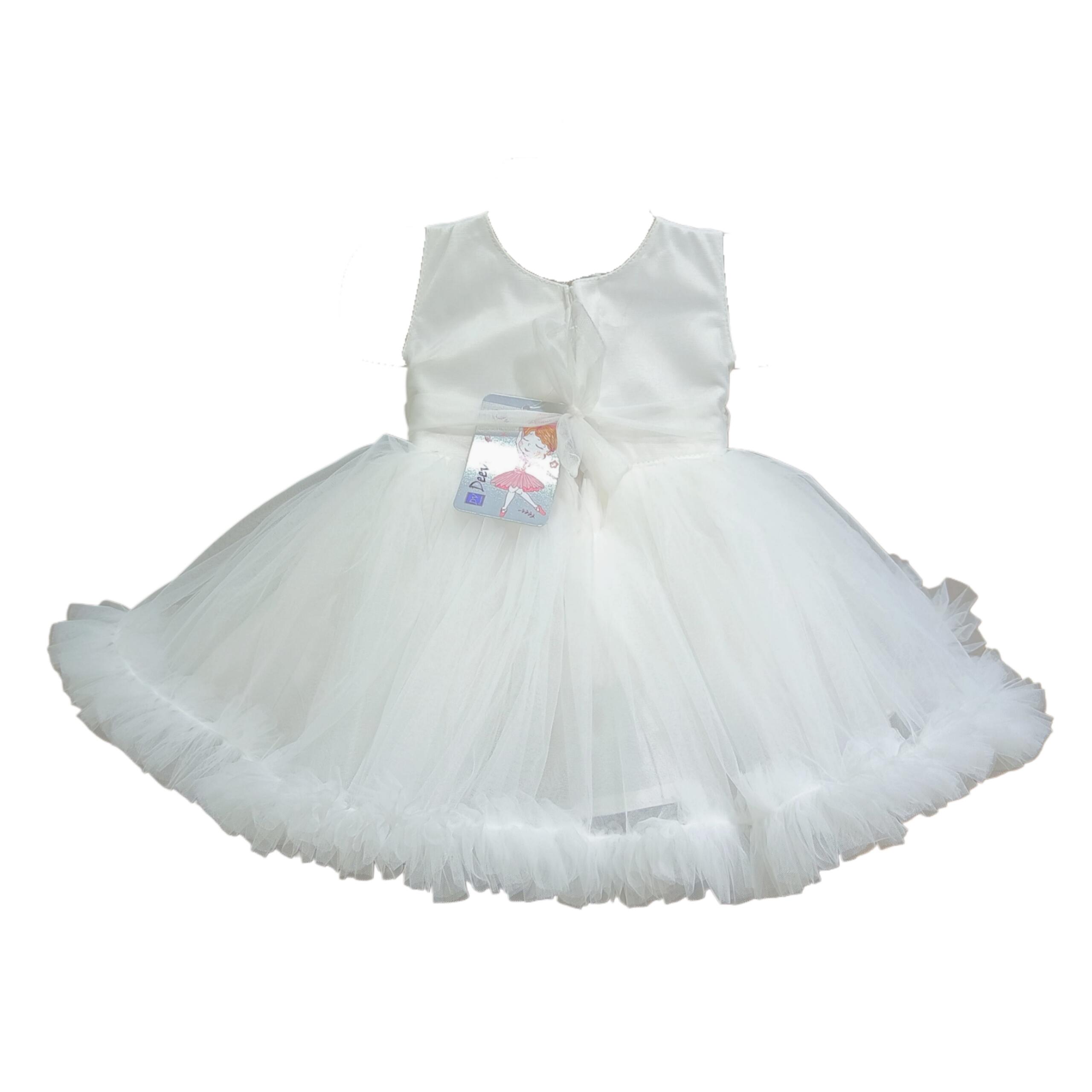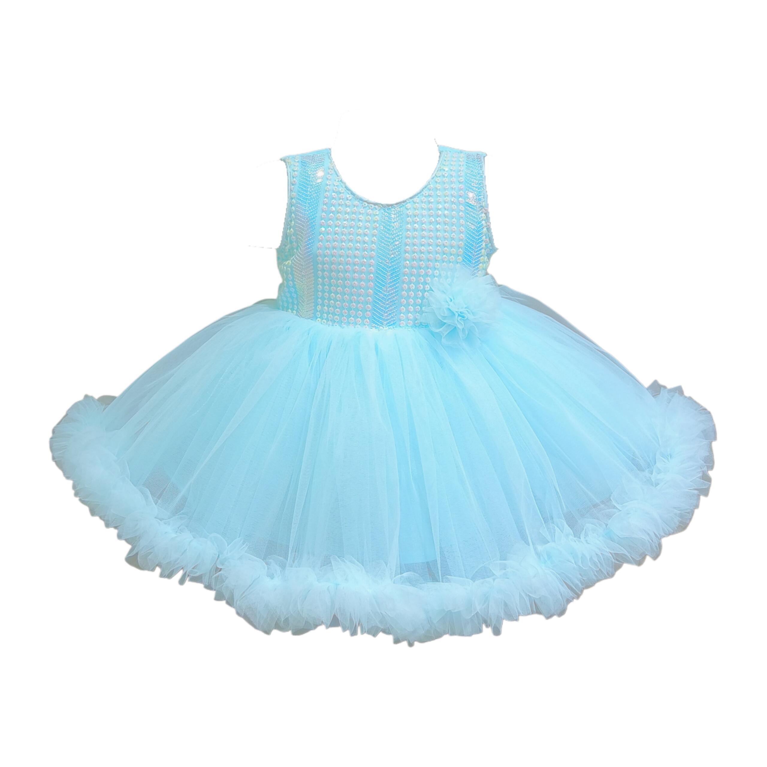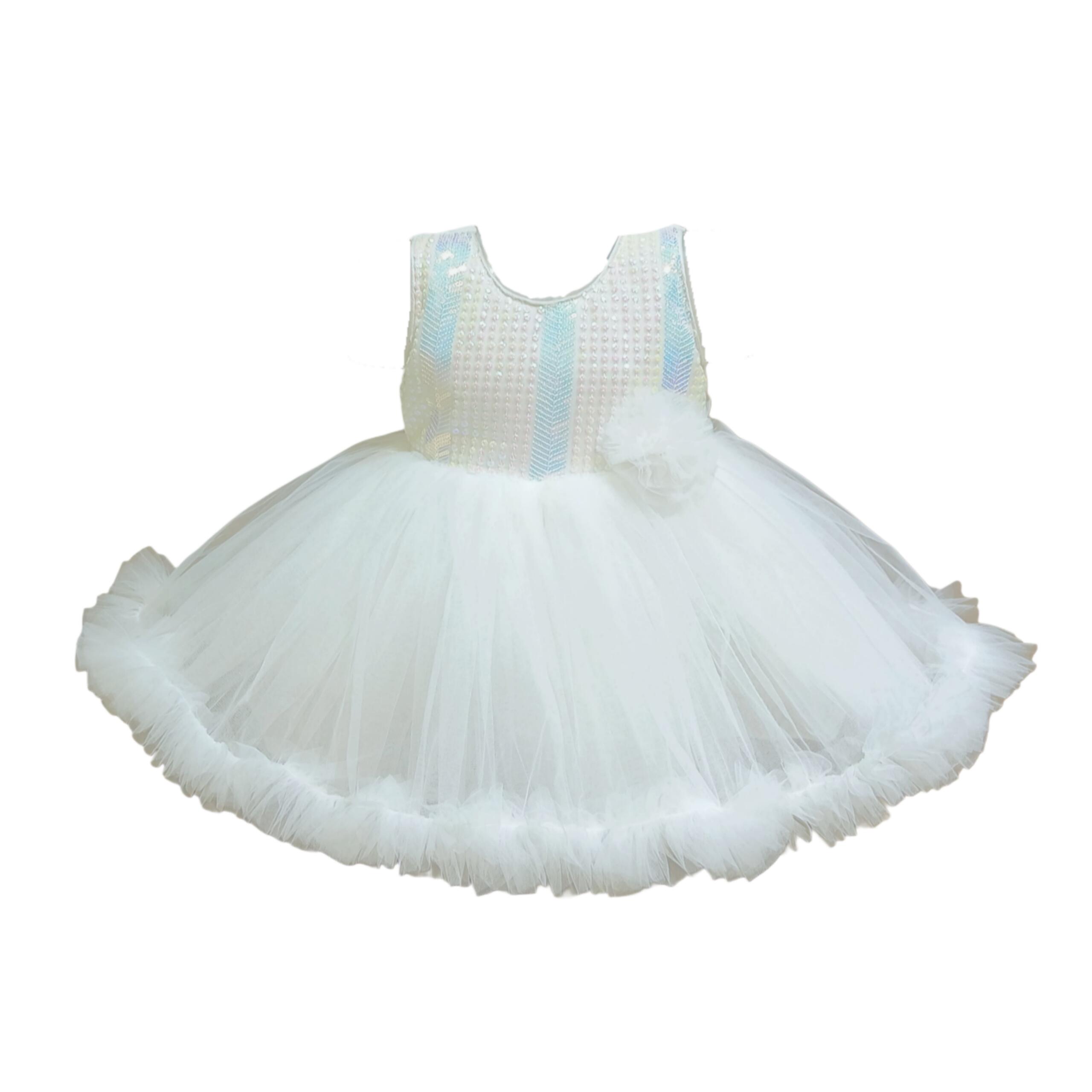 Dress your little one in this enchanting white princess frock, perfect for special occasions like birthdays, parties, or photoshoots. The sleeveless design features a shimmering sequin bodice and a voluminous, layered net skirt for a dreamy, ethereal look. A delicate flower appliqué adorns the waist, adding a touch of charm. Crafted for comfort and style, this beautiful dress will make your baby girl feel like royalty. Available in various sizes, it’s an ideal choice for memorable moments.