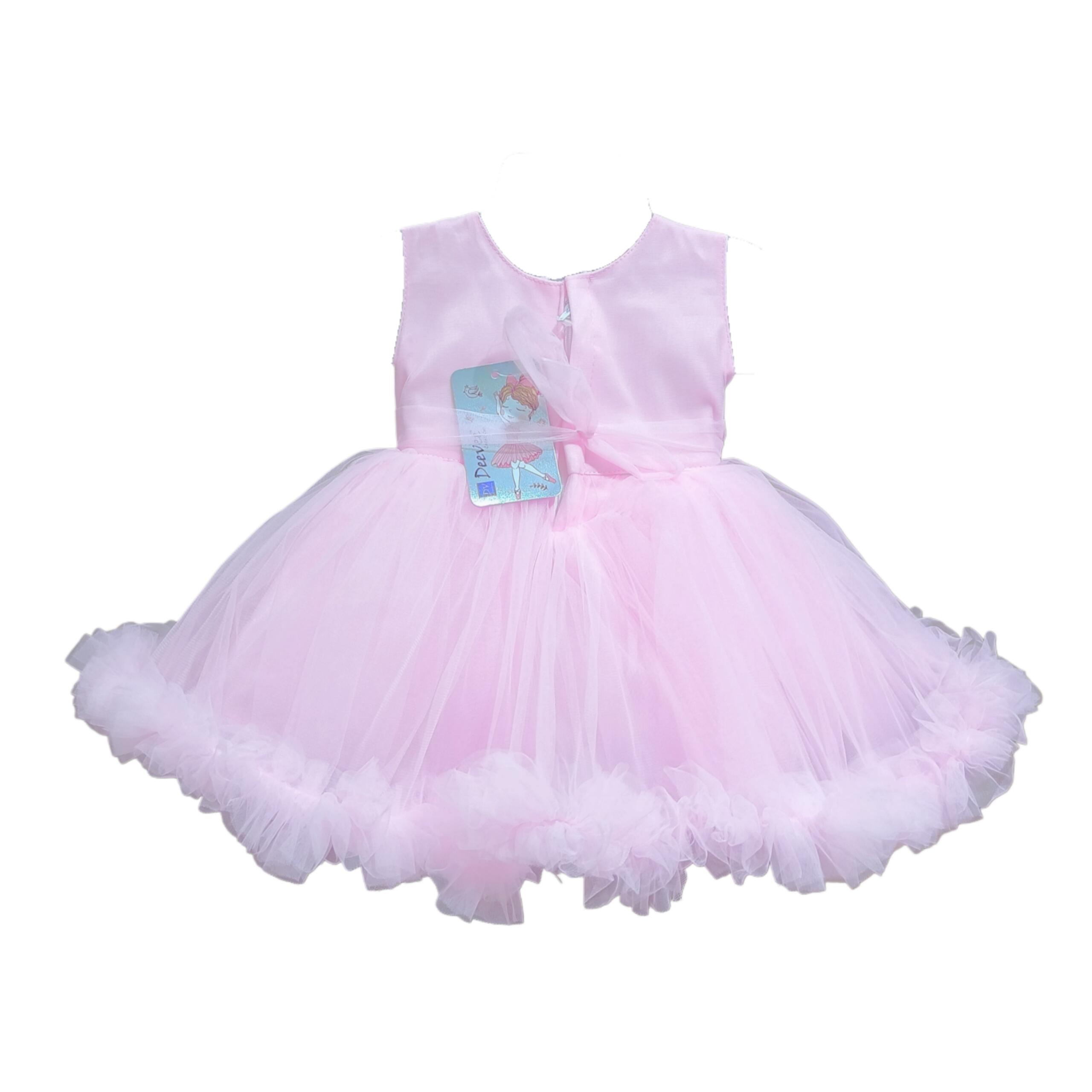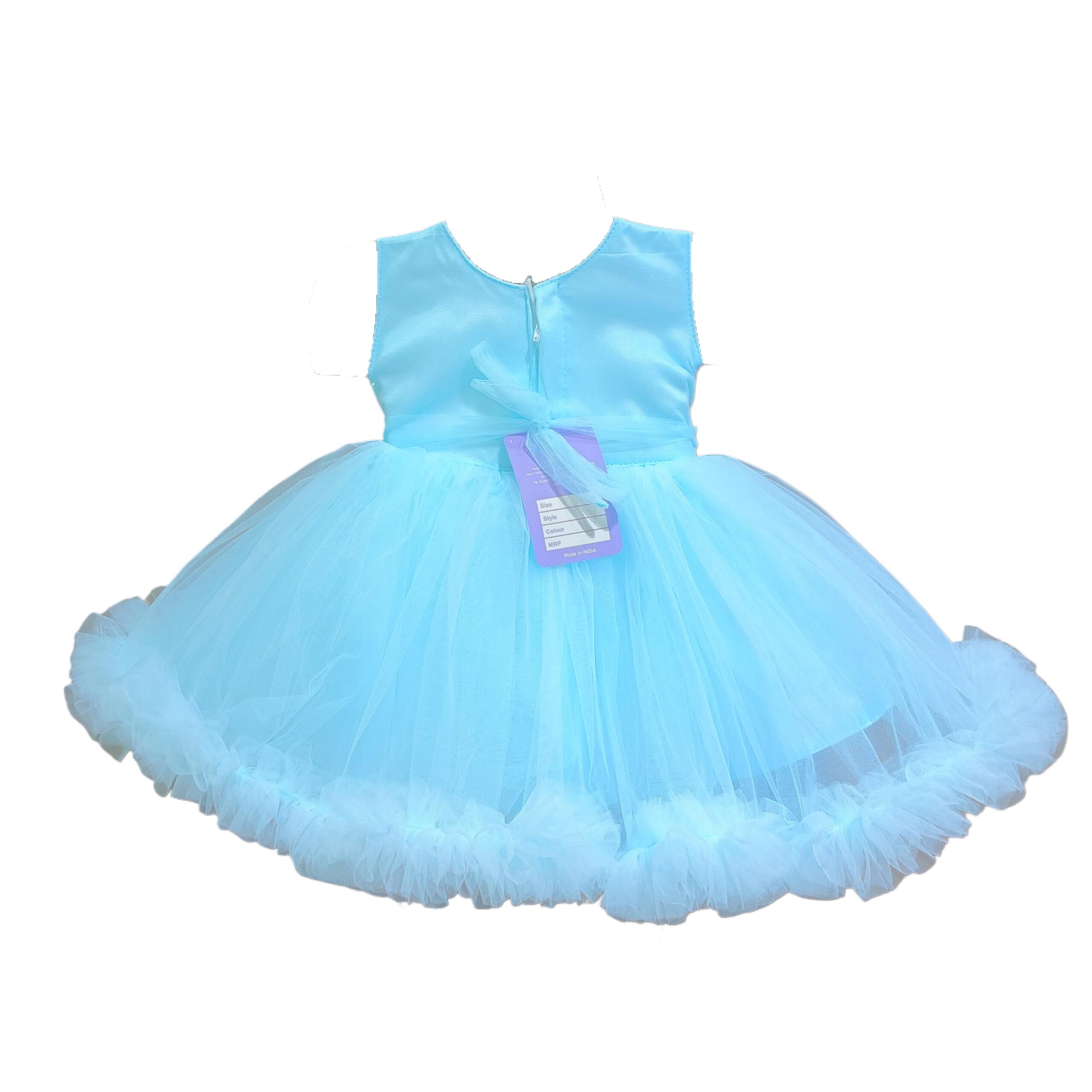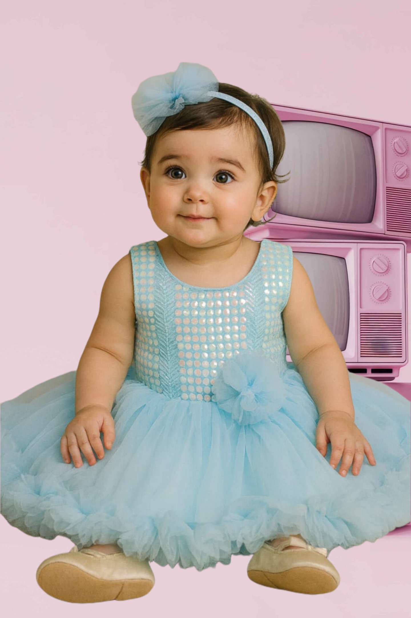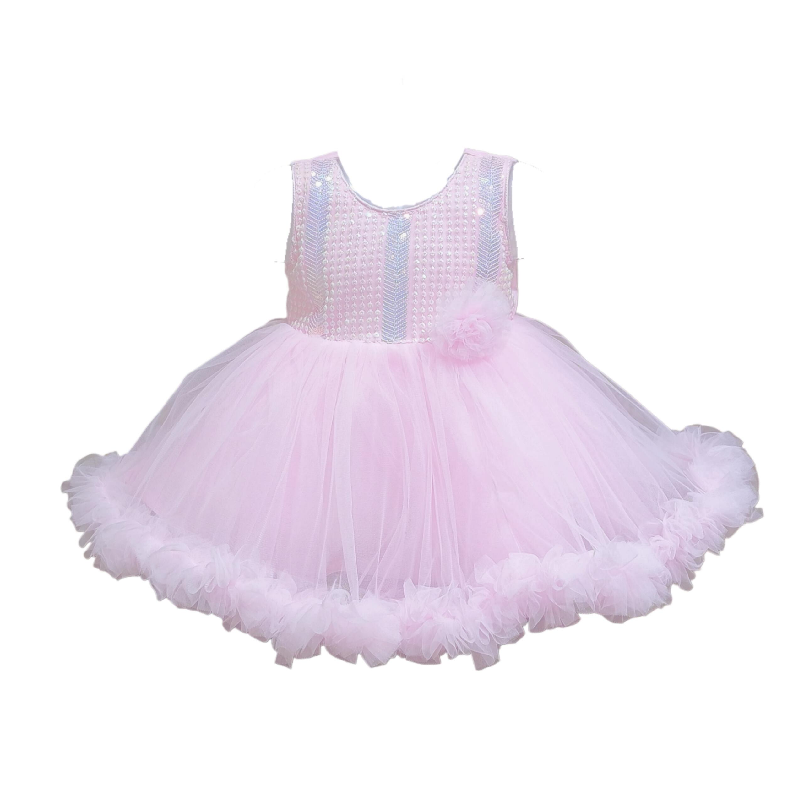 Dress your little one in this enchanting white princess frock, perfect for special occasions like birthdays, parties, or photoshoots. The sleeveless design features a shimmering sequin bodice and a voluminous, layered net skirt for a dreamy, ethereal look. A delicate flower appliqué adorns the waist, adding a touch of charm. Crafted for comfort and style, this beautiful dress will make your baby girl feel like royalty. Available in various sizes, it’s an ideal choice for memorable moments.