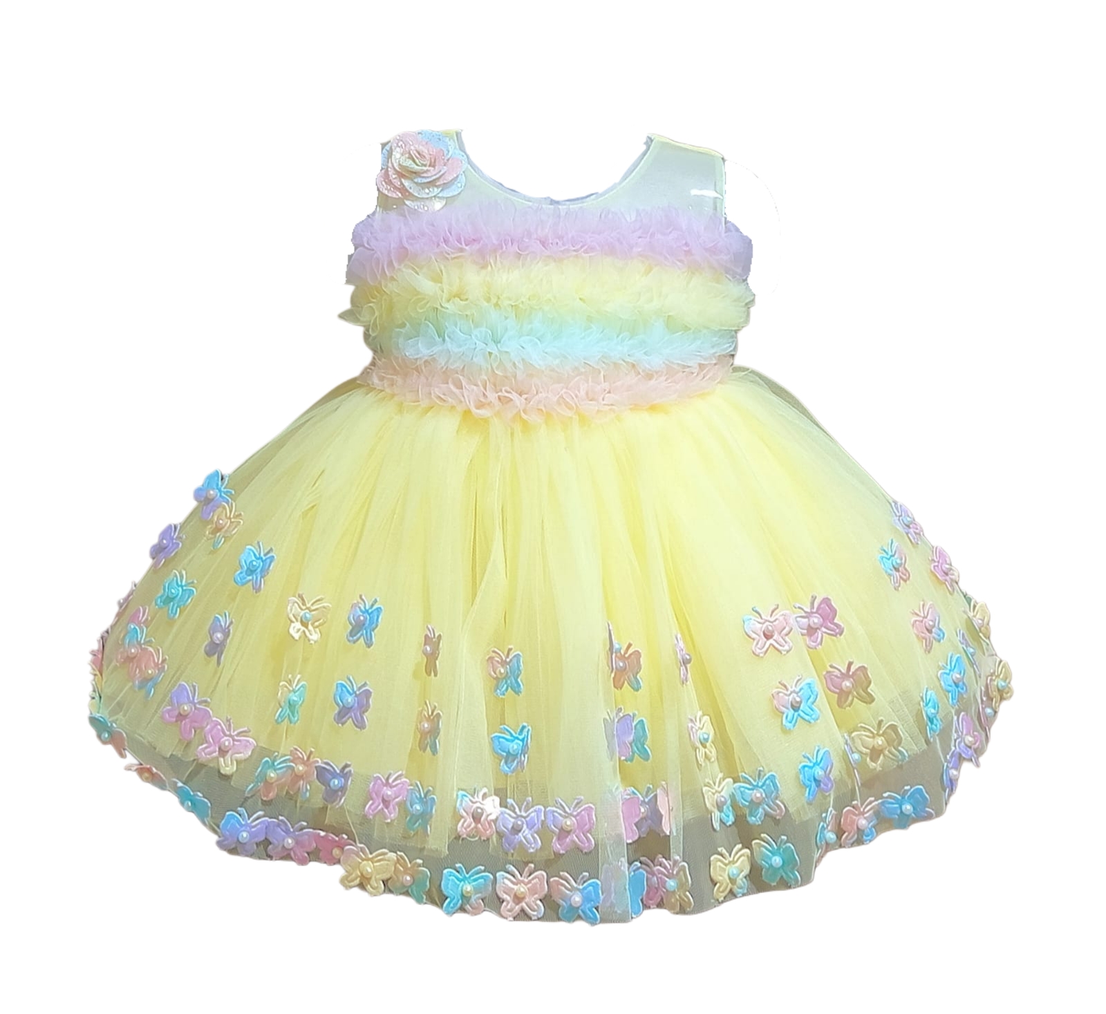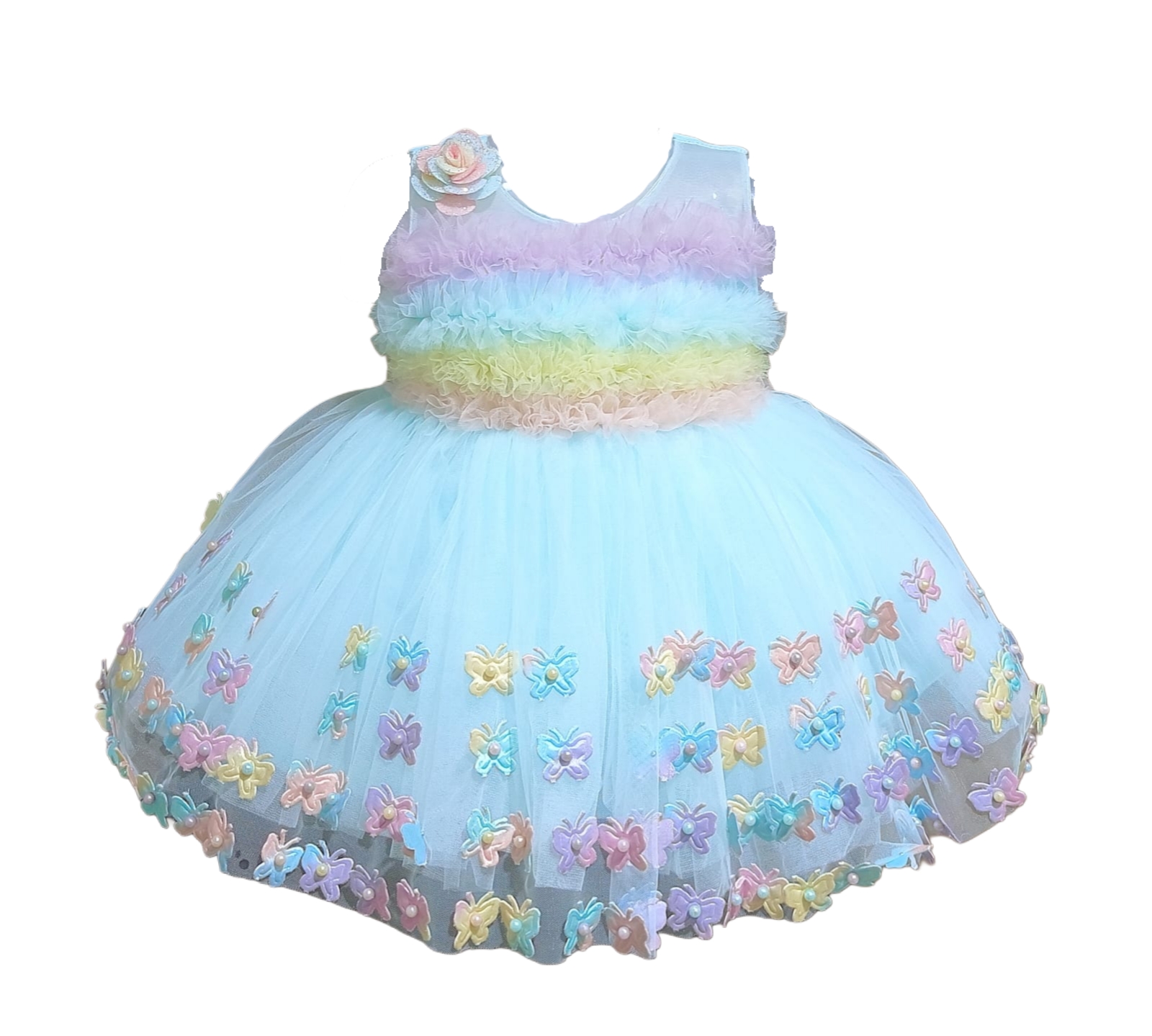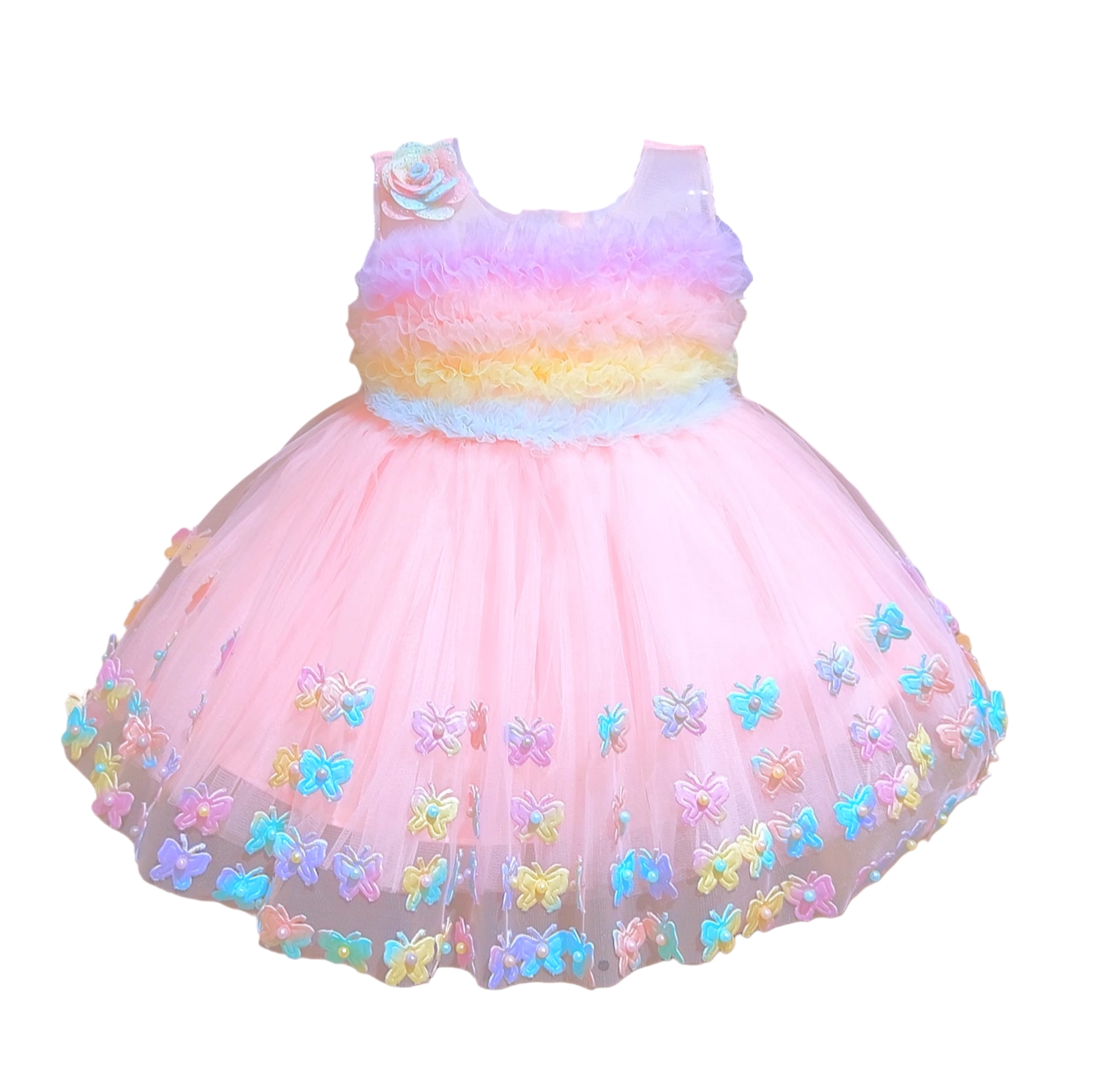 Dress your little angel in this enchanting Rainbow frock, designed to make every occasion extra special. Featuring a sleeveless bodice with layered pastel ruffles and a delicate floral embellishment on the shoulder, this dress combines charm with elegance. The flared net skirt is beautifully decorated with colorful 3D flower appliqués, adding a playful yet graceful touch. Crafted from soft, breathable Net fabric with a comfortable inner lining, it ensures ease of movement for your baby girl. Perfect for birthdays, weddings, festive celebrations, and photoshoots, this lightweight and stylish frock makes your child stand out with a magical, fairy-like charm.