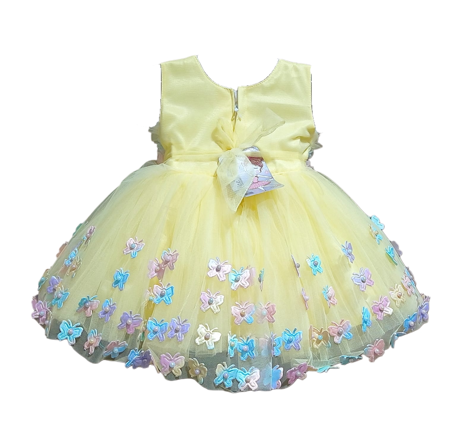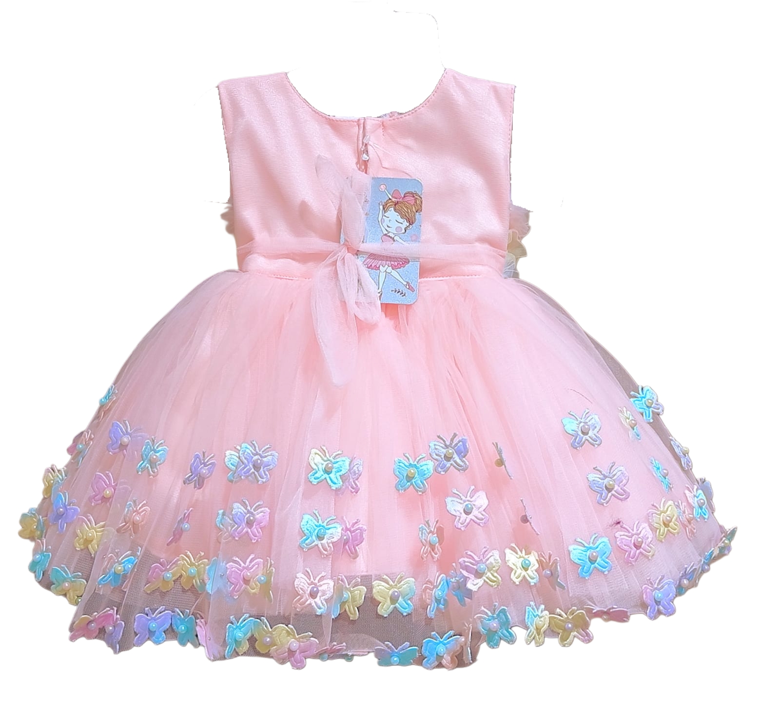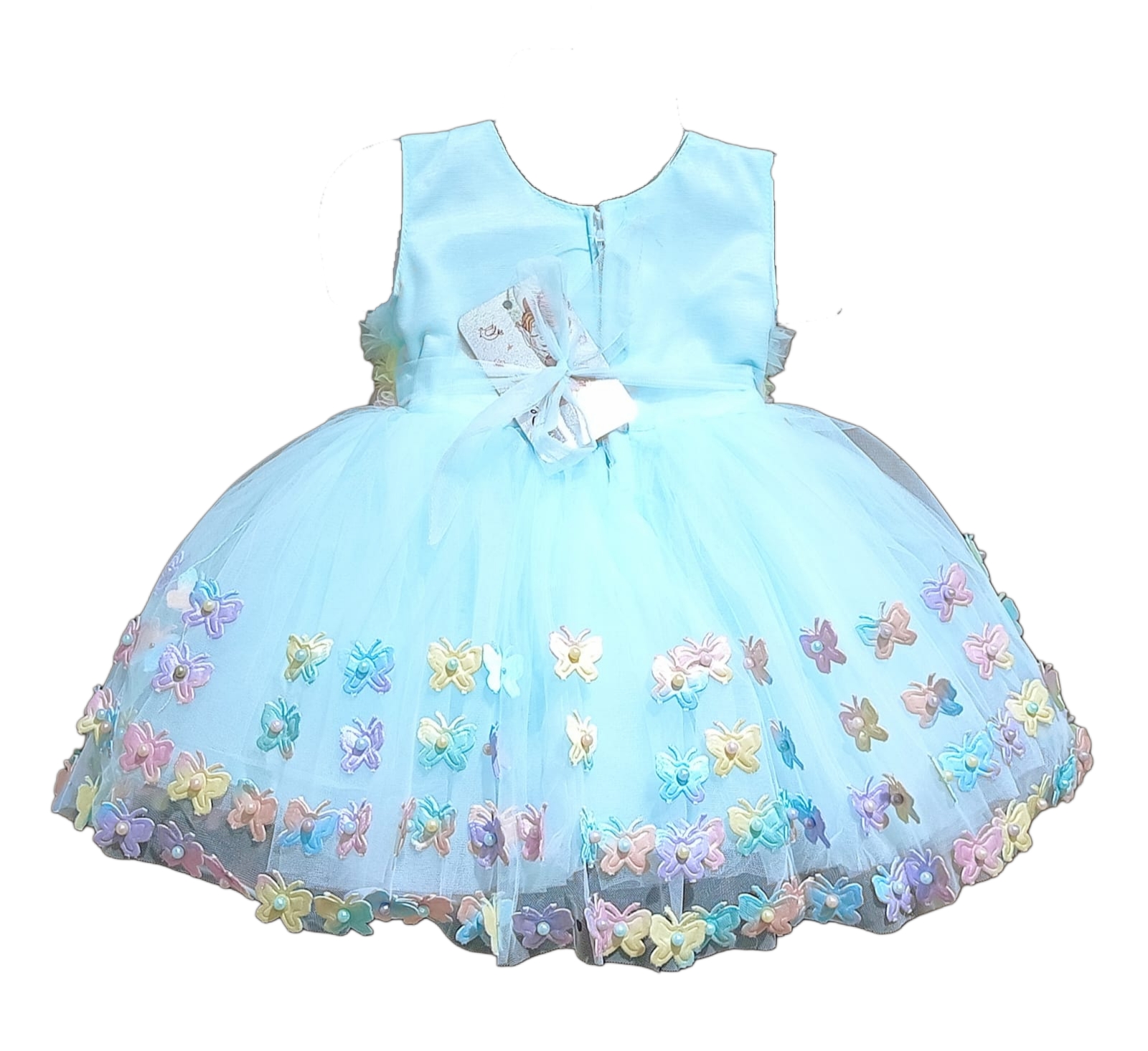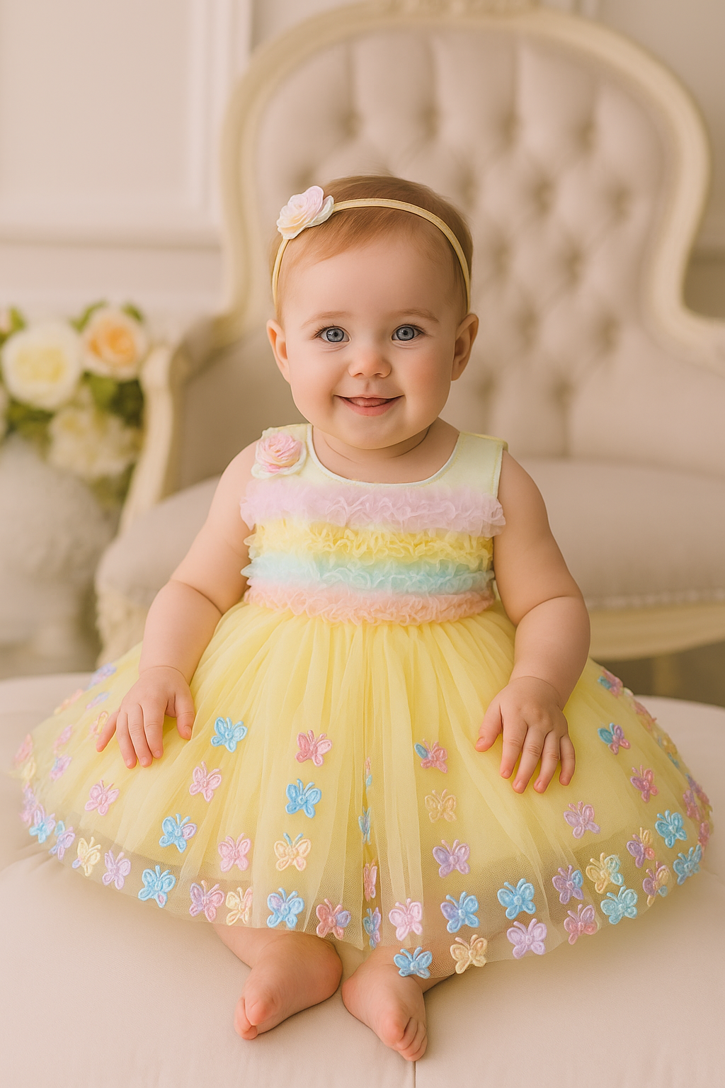 Dress your little angel in this enchanting Rainbow frock, designed to make every occasion extra special. Featuring a sleeveless bodice with layered pastel ruffles and a delicate floral embellishment on the shoulder, this dress combines charm with elegance. The flared net skirt is beautifully decorated with colorful 3D flower appliqués, adding a playful yet graceful touch. Crafted from soft, breathable Net fabric with a comfortable inner lining, it ensures ease of movement for your baby girl. Perfect for birthdays, weddings, festive celebrations, and photoshoots, this lightweight and stylish frock makes your child stand out with a magical, fairy-like charm.