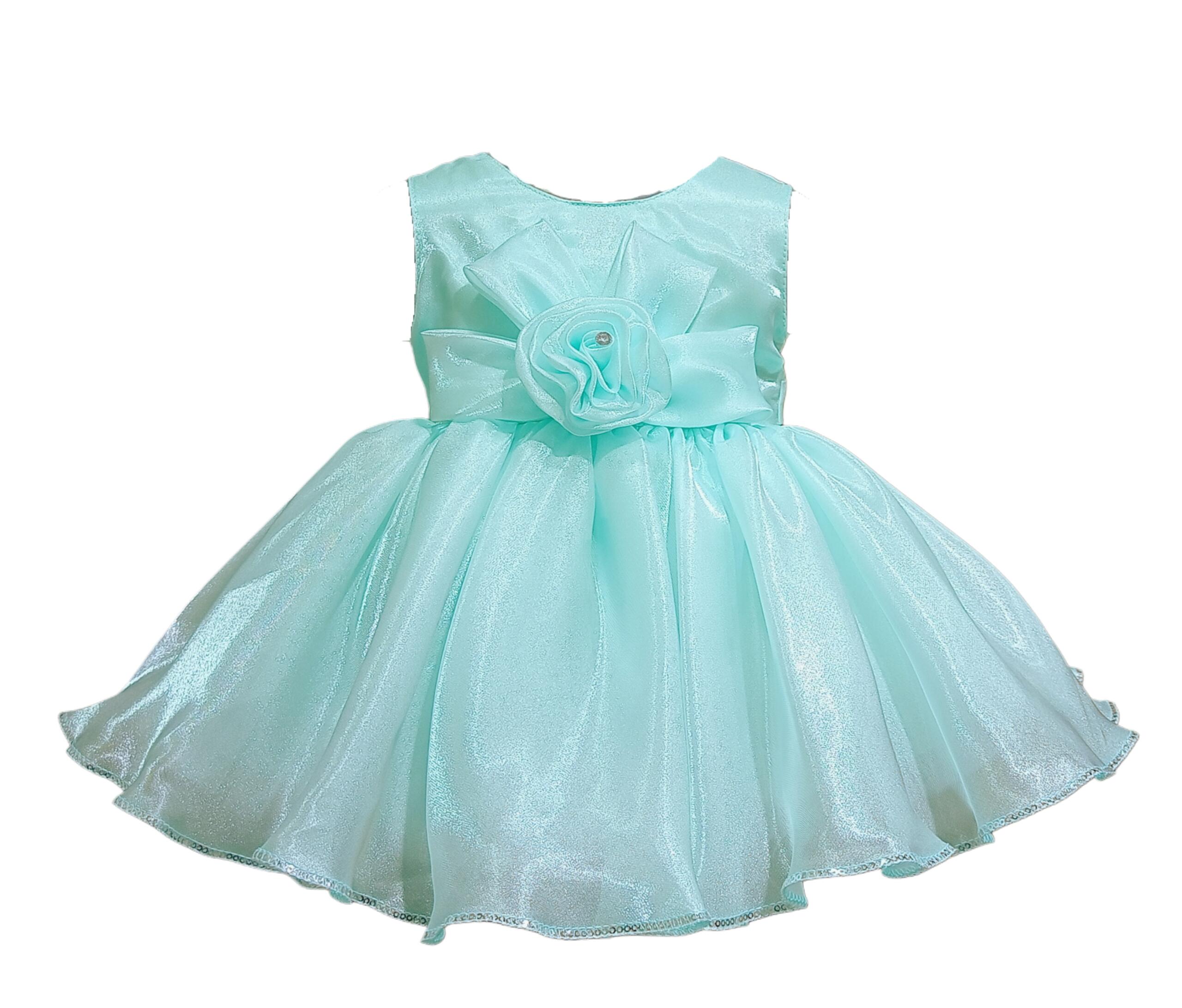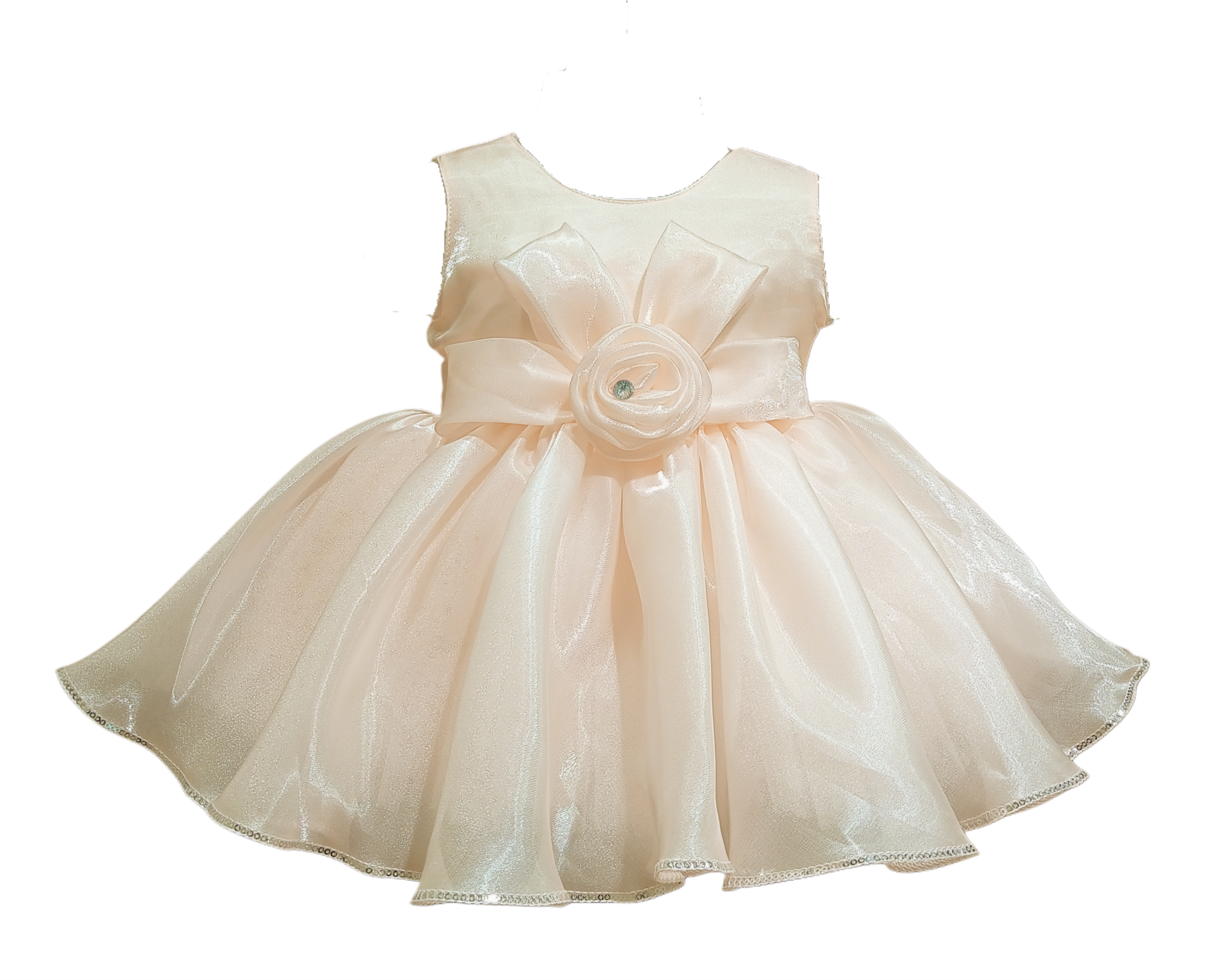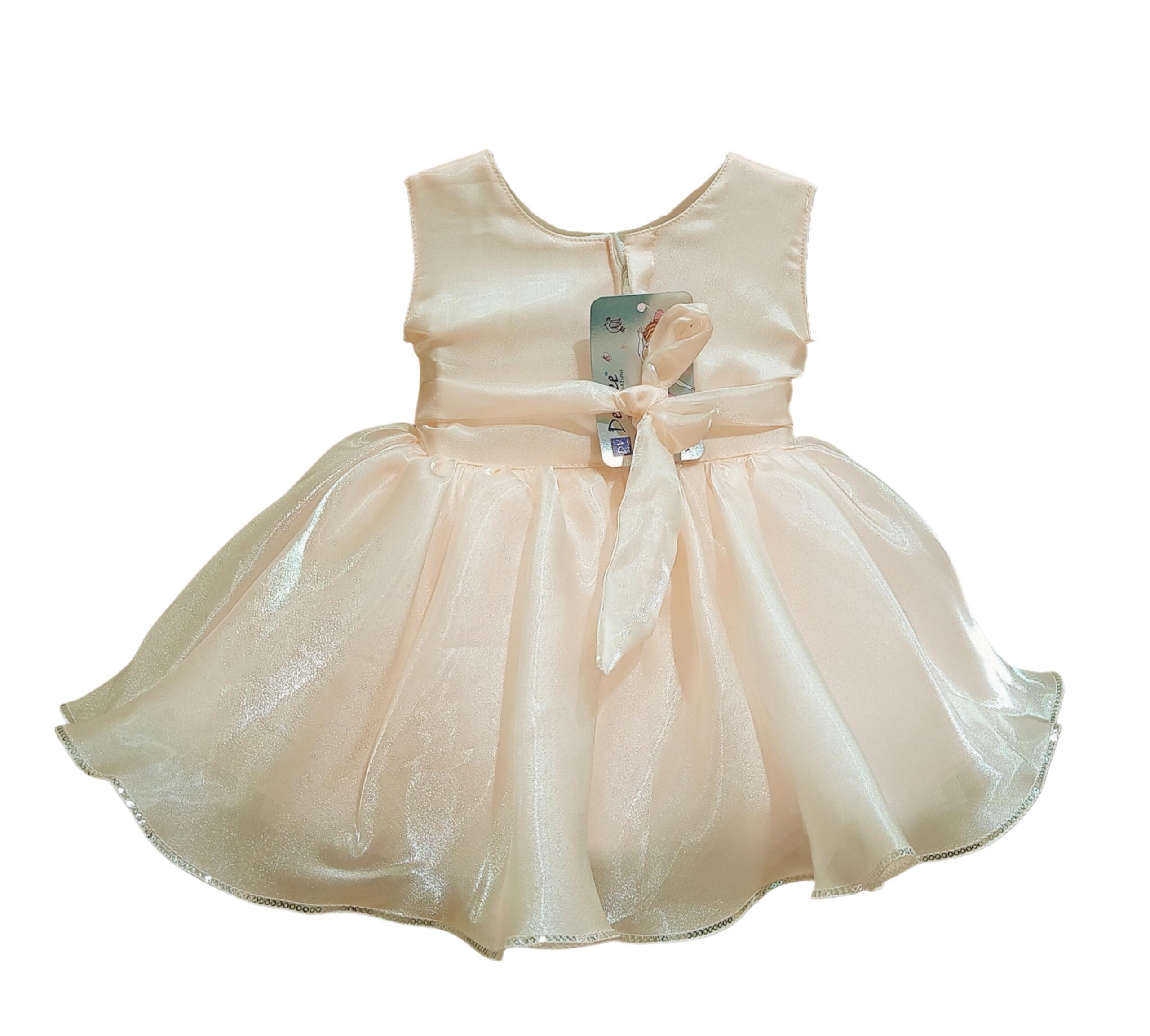 This charming Party Frock is perfect for your little one’s special occasions. Crafted from soft, breathable satin and organza, this sleeveless dress features a delightful flared silhouette, ensuring comfort and freedom of movement for cute & active infants. The bodice is elegantly designed with subtle pleating and a prominent, centrally placed fabric flower appliqué adorned with a delicate rhinestone detail, adding a touch of sparkle and sophistication. Ideal for birthdays, festive celebrations, or any joyous event, this beautiful frock combines timeless elegance with playful charm, making your baby girl shine. Easy to wear and designed for memorable moments, it’s a must-have addition to her wardrobe.