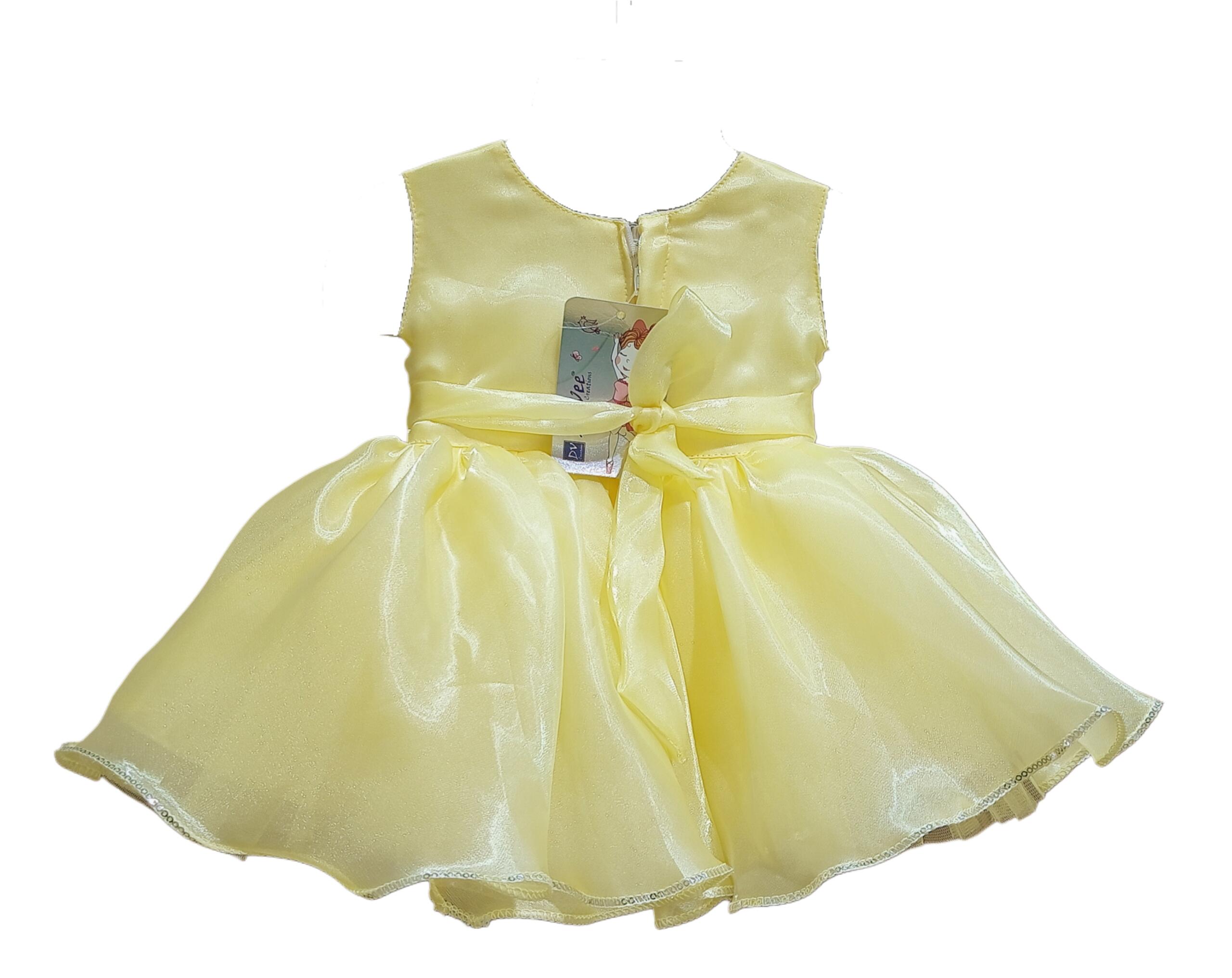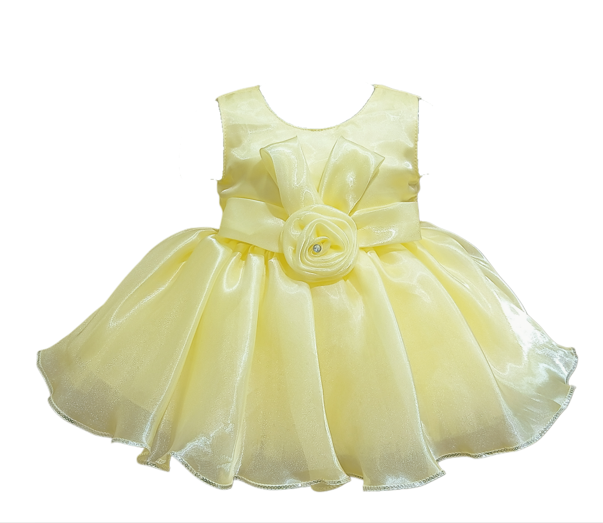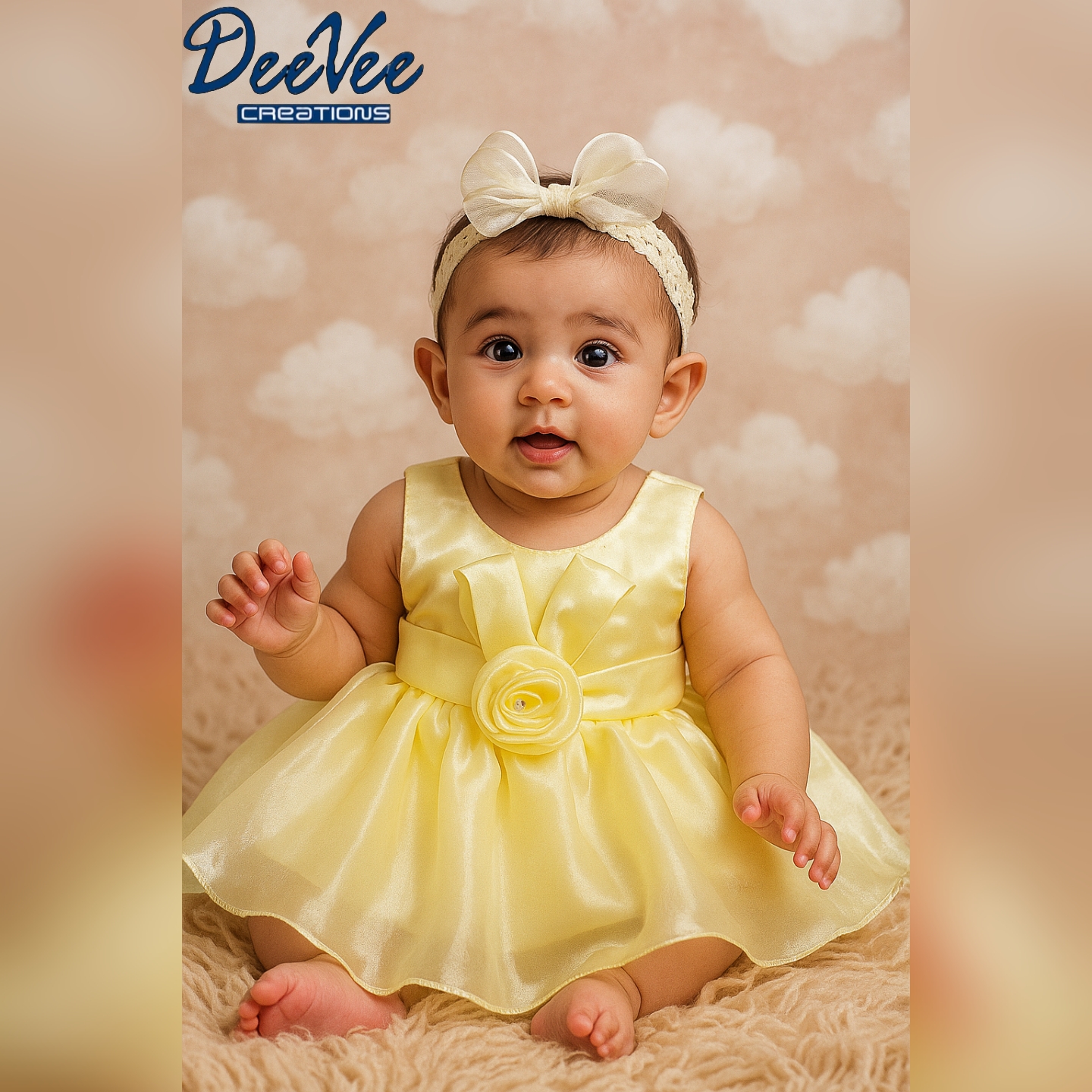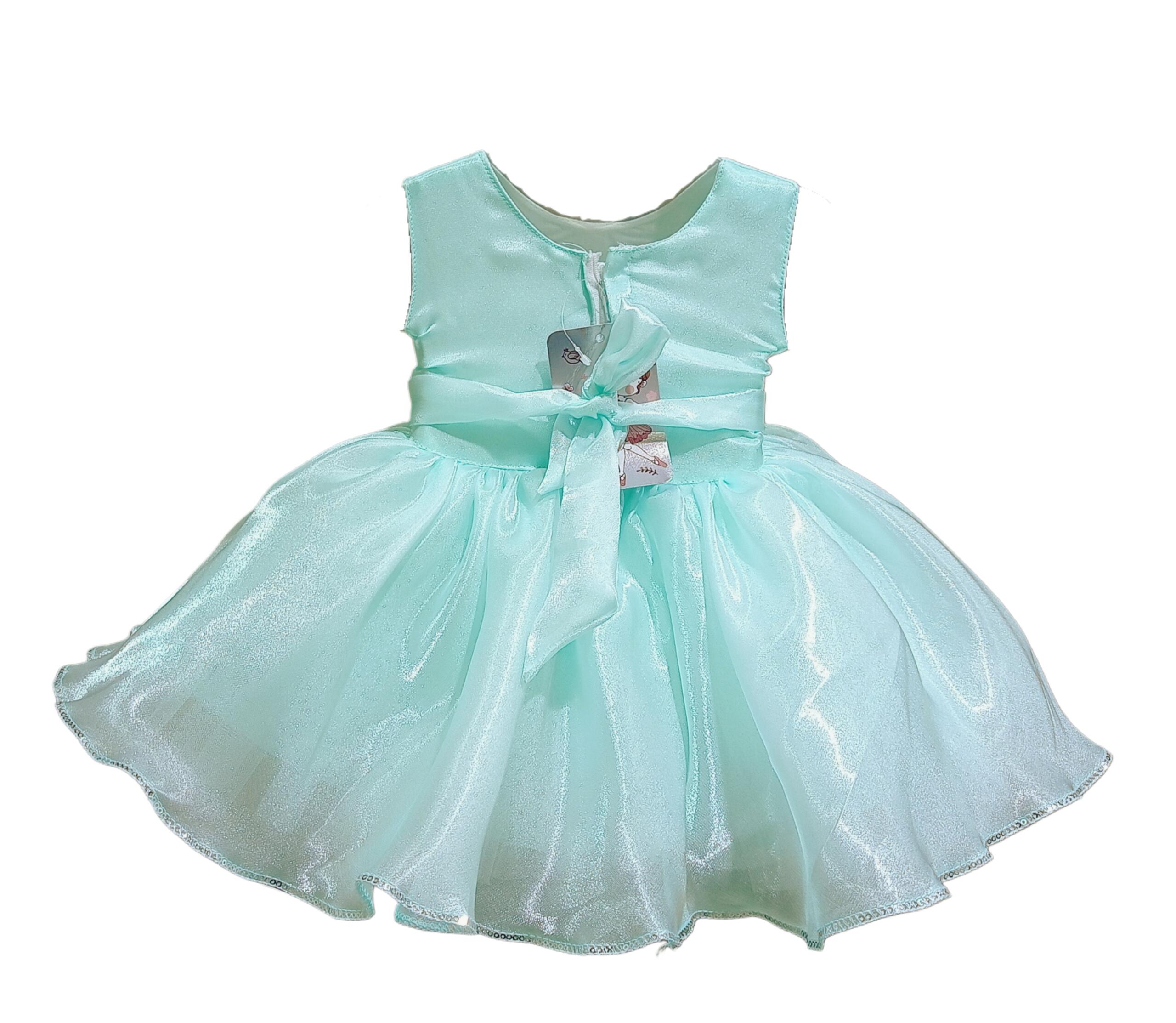 This charming Party Frock is perfect for your little one’s special occasions. Crafted from soft, breathable satin and organza, this sleeveless dress features a delightful flared silhouette, ensuring comfort and freedom of movement for cute & active infants. The bodice is elegantly designed with subtle pleating and a prominent, centrally placed fabric flower appliqué adorned with a delicate rhinestone detail, adding a touch of sparkle and sophistication. Ideal for birthdays, festive celebrations, or any joyous event, this beautiful frock combines timeless elegance with playful charm, making your baby girl shine. Easy to wear and designed for memorable moments, it’s a must-have addition to her wardrobe.