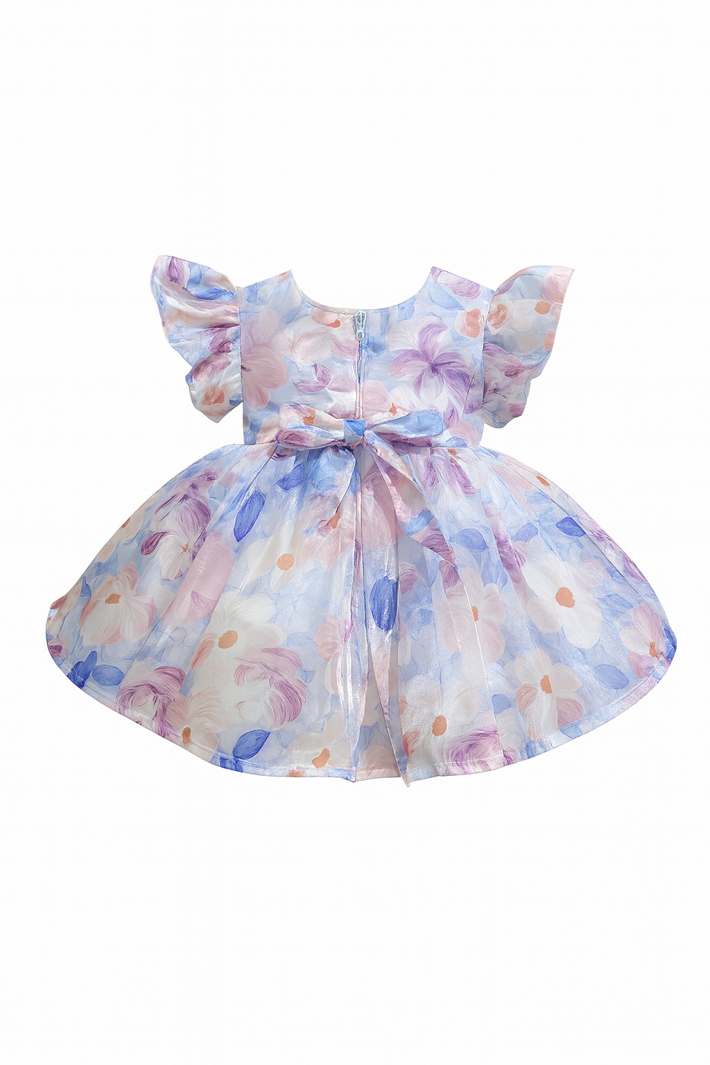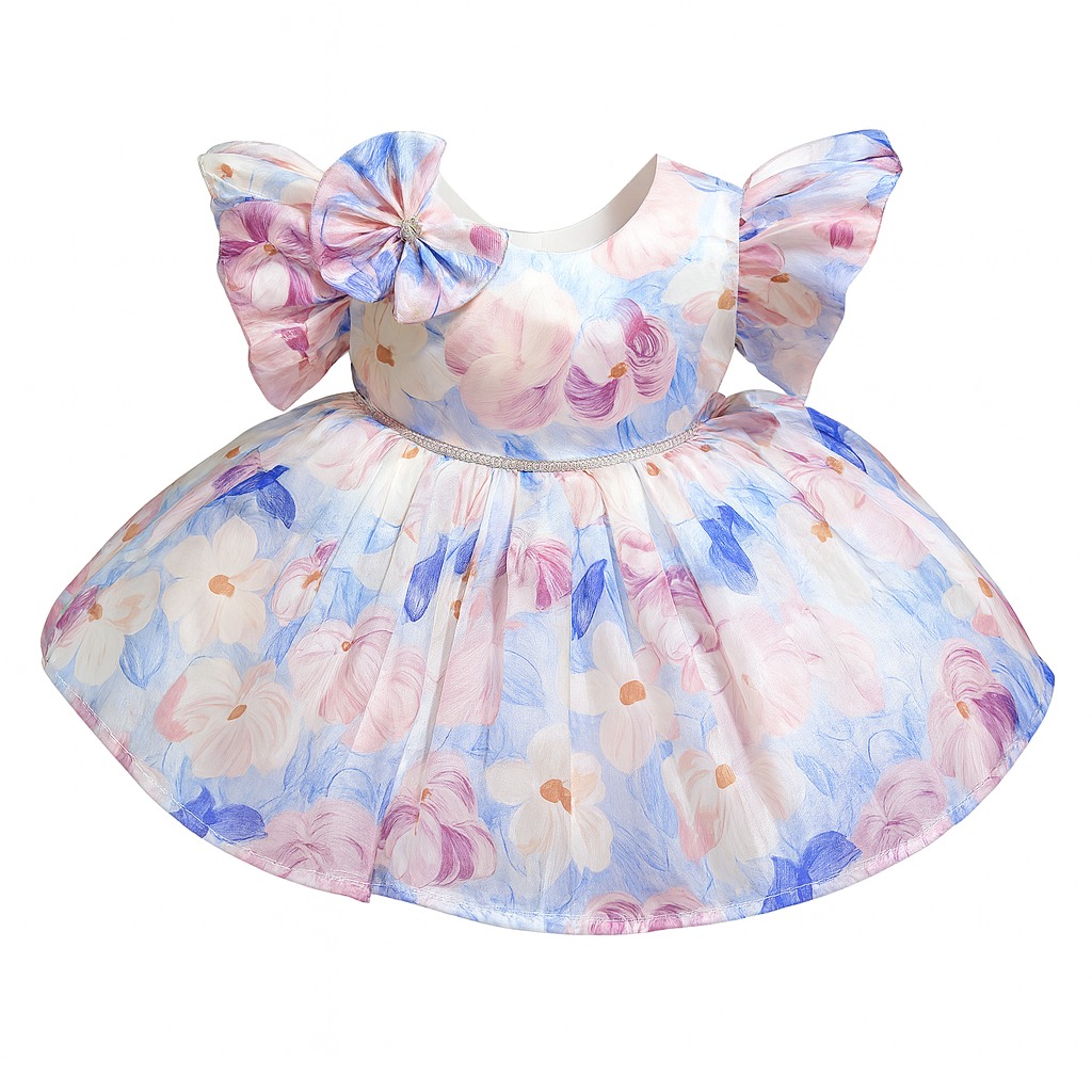 This beautiful baby girl dress features a soft and elegant pastel floral print with shades of pink, lavender, white, and light blue. The fabric has a subtle shimmer, giving the dress a luxurious and festive appearance. The bodice includes adorable puff sleeves that add volume and charm, making it look extra princess-like.